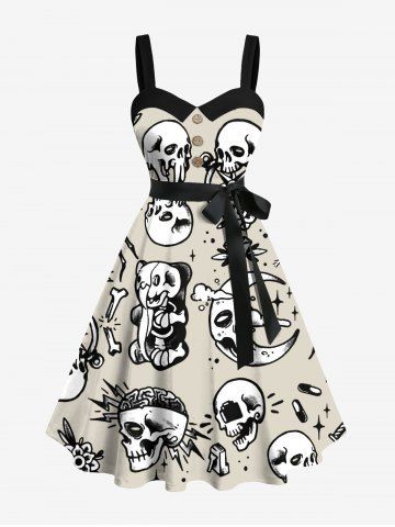Plus Size Skulls Rose Flower Moon Diamond Print Buttons Turn Down Collar Hawaii Dress With Belt - Beige - 6x