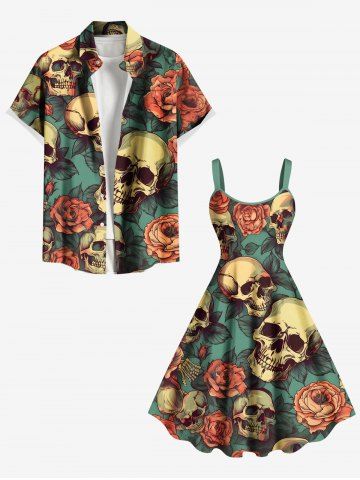 Plus Size Skulls Rose Flowers Leaf Print Hawaii Tank Dress - Green - L