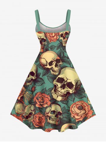 Plus Size Skulls Rose Flowers Leaf Print Hawaii Tank Dress - Green - 3x