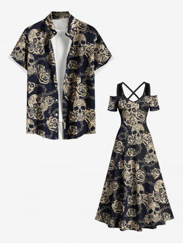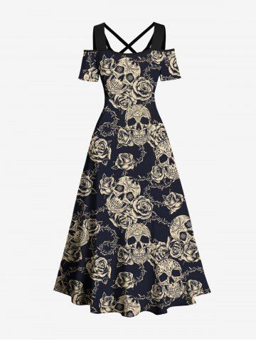Graphic Dresses > Plus Size Skulls Rose Flowers Print Cold Shoulder Crisscross Hawaii Maxi Dress