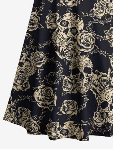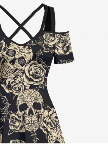 Plus Size Skulls Rose Flowers Print Cold Shoulder Crisscross Hawaii Maxi Dress - Black - 3x