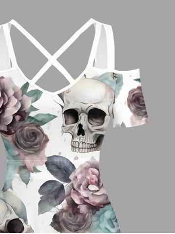 Plus Size Skulls Rose Flowers Print Cold Shoulder Crisscross Hawaii Maxi Dress - White - Xs