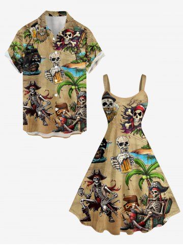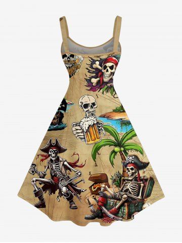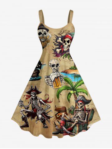 Plus Size Skulls Skeleton Pirate Coconut Tree Beer Print Hawaii A Line Dress - Tan - 4x