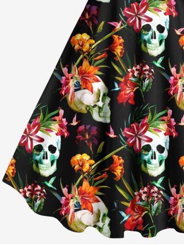 Plus Size Skulls Tropical Leaf Flowers Print Hawaii Tank Dress - Black - S