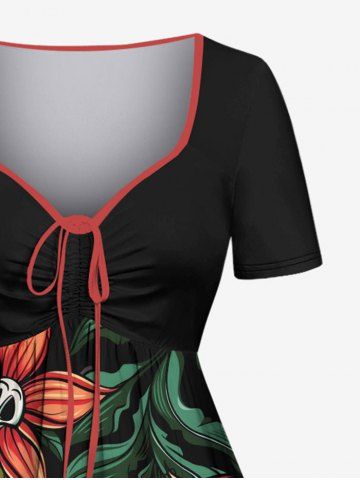 Plus Size Skulls Tropical Leaf Hibiscus Flowers Print Cinched Hawaii Dress - Black - 1x