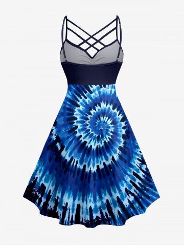 Plus Size Spiral Tie Dye Print Hawaii Ruched Crisscross Strappy A Line Cami Dress - Blue - 2x