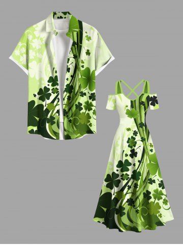 Graphic Dresses > Plus Size St. Patrick's Day Four Leaf Clover Print Cold Shoulder Crisscross Maxi Dress