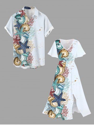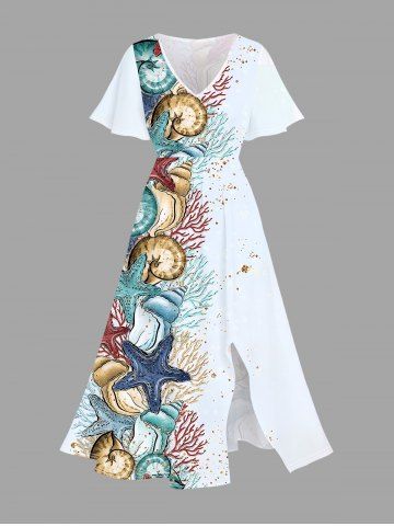 Graphic Dresses > Plus Size Starfish Conch Coral Print Split Hawaii Midi Dress
