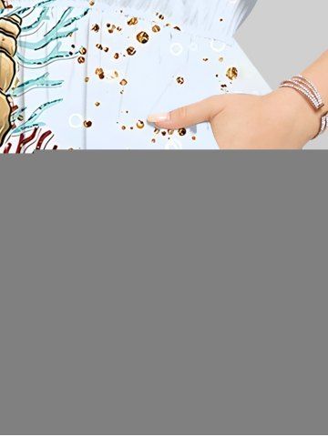 Plus Size Starfish Conch Coral Print Split Hawaii Midi Dress - Light Blue - Xs