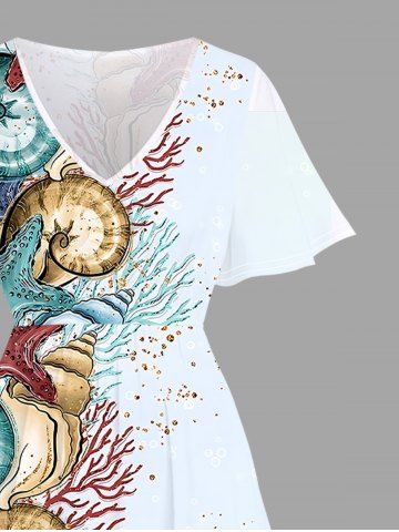 Plus Size Starfish Conch Coral Print Split Hawaii Midi Dress - Light Blue - L