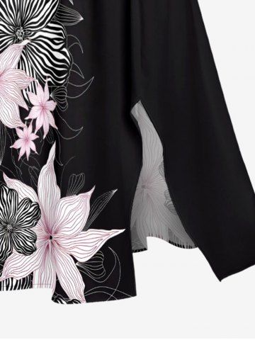 Plus Size Striped Flowers Print Split Hawaii Midi Dress - Black - Xxs