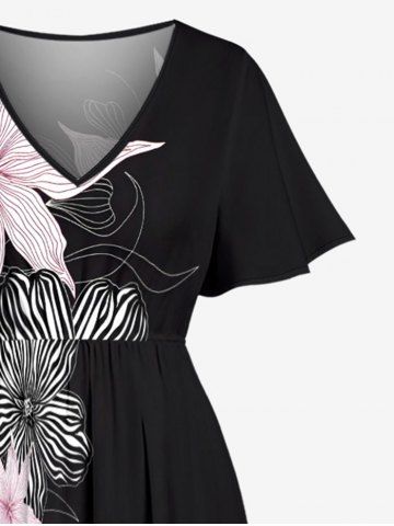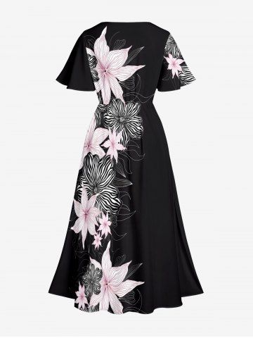 Plus Size Striped Flowers Print Split Hawaii Midi Dress - Black - 1x