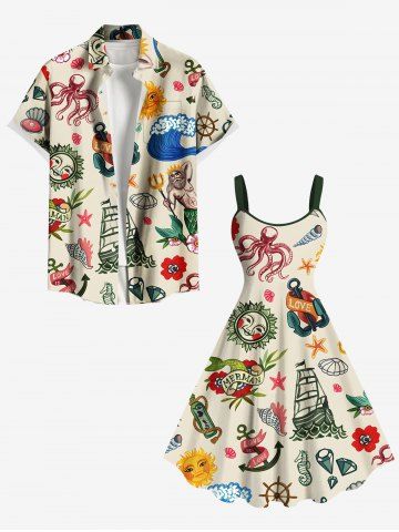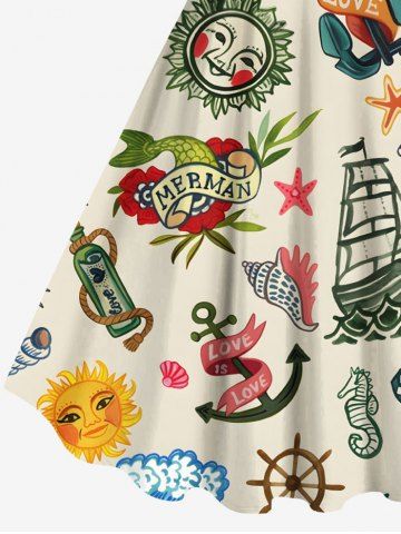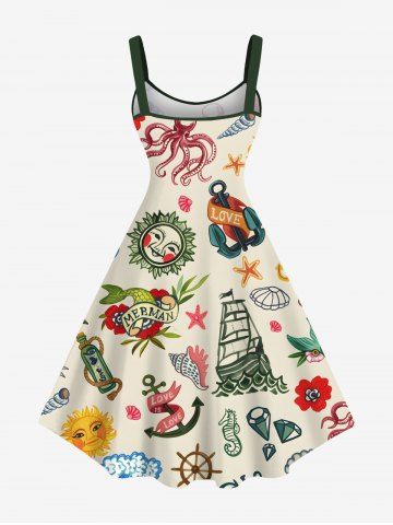 Plus Size Sun Mermaid Sailboat Octopus Sea Waves Shell Print Hawaii A Line Tank Dress - Beige - 4x