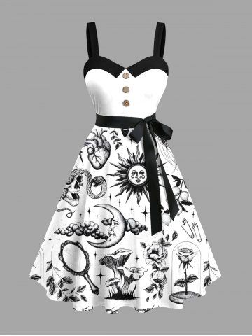Plus Size Sun Moon Cloud Flower Mushroom Skull Snake Print Halloween Button A Line Dress with Removable Belt - White - 2x