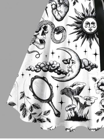 Plus Size Sun Moon Cloud Flower Mushroom Skull Snake Print Halloween Button A Line Dress with Removable Belt - White - 3x