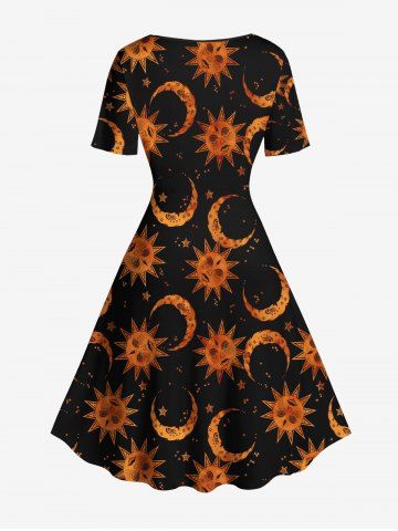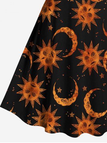Plus Size Sun Moon Star Face Print A Line Dress - Black - 5x