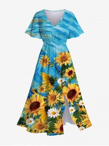 Graphic Dresses > Hawaii Plus Size Sunflower Daisy Painting Print Split Pocket A Line Dress