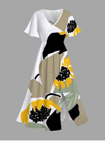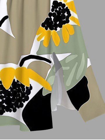 Graphic Dresses > Plus Size Sunflower Floral Leaf Colorblock Print Hawaii Split Pocket A Line Midi Dress