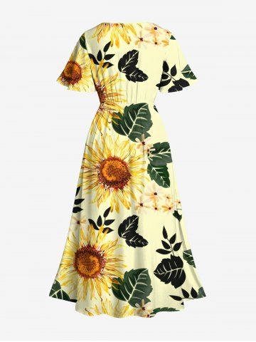 Plus Size Sunflower Leaf Branch Print Hawaii Split Pocket A Line Midi Dress - Yellow - Xxs