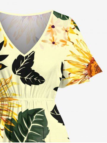 Plus Size Sunflower Leaf Branch Print Hawaii Split Pocket A Line Midi Dress - Yellow - S