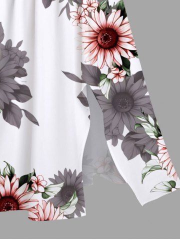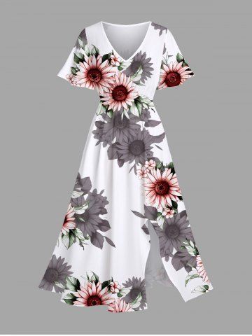 Plus Size Sunflower Leaves Print Hawaii Split Pocket A Line Midi Dress - White - L