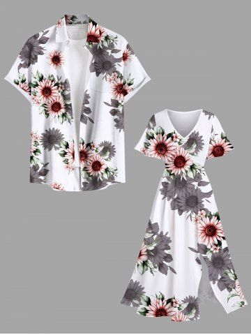 Plus Size Sunflower Leaves Print Hawaii Split Pocket A Line Midi Dress - White - 2x