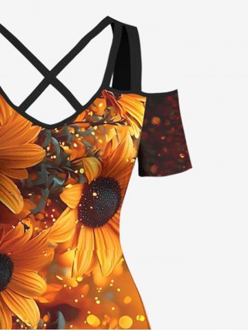Plus Size Sunflower Ombre Light Spot Print Hawaii Cold Shoulder Crisscross A Line Maxi Dress - Orange - 5x