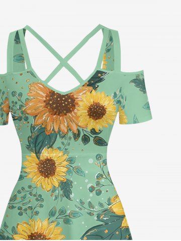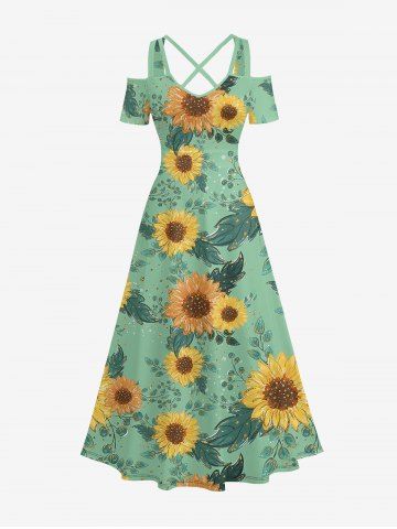 Plus Size Sunflowers Leaf Oil Painting Print Cold Shoulder Crisscross Hawaii Maxi Dress - Green - Xs