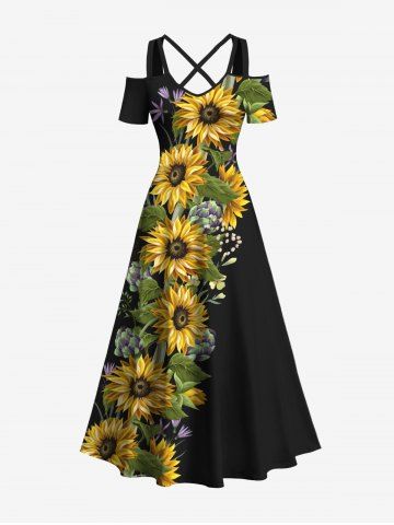 Plus Size Sunflowers Leaf Print Cold Shoulder Crisscross Hawaii Maxi Dress - Black - 2x
