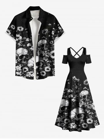 Plus Size Sunflowers Skulls Print Cold Shoulder Crisscross Hawaii Maxi Dress - Black - L