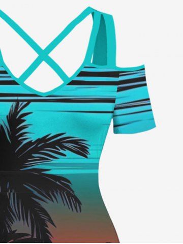 Plus Size Sunset Colorful Colorblock Sky Coconut Tree Print Cold Shoulder Crisscross Hawaii Maxi Dress - Multi-a - 2x