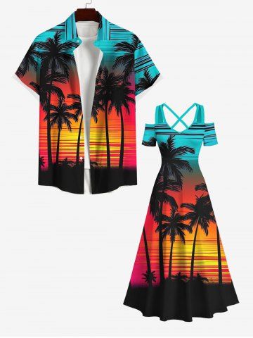 Graphic Dresses > Plus Size Sunset Colorful Colorblock Sky Coconut Tree Print Cold Shoulder Crisscross Hawaii Maxi Dress