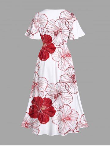 Plus Size Textured Hibiscus Flower Print Hawaii Split Pocket A Line Midi Dress - Red - 3x