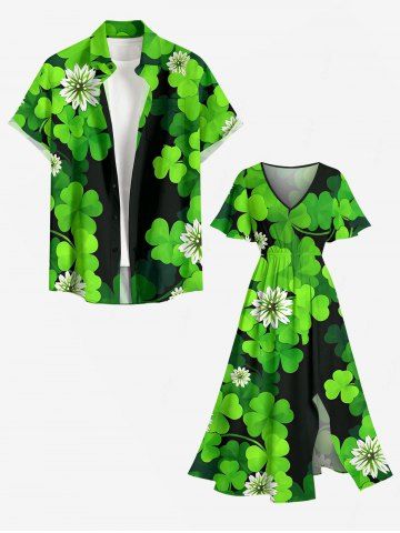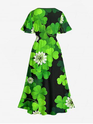 Plus Size Three Leaf Clover Flower Print St. Patrick's Day Hawaii Split Pocket A Line Midi Dress - Green - 4x
