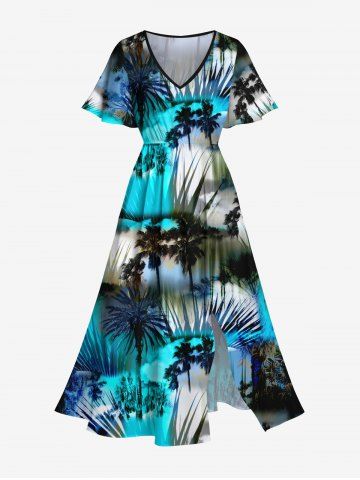 Graphic Dresses > Plus Size Tie Dye Colorblock Coconut Tree Print Split Hawaii Midi Dress