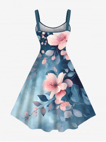Plus Size Tie Dye Ombre Flowers Leaf Print Hawaii Tank Dress - Blue - 5x
