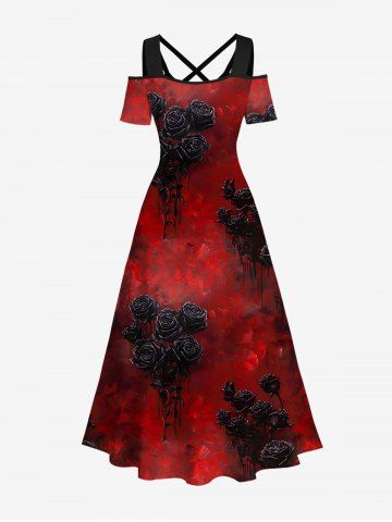 Plus Size Tie Dye Ombre Rose Flower Print Halloween Costume Cold Shoulder Crisscross A Line Maxi Dress - Red - L