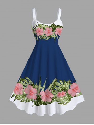 Plus Size Topical Leaf Hibiscus Flower Print Hawaii Tank Dress - Blue - S