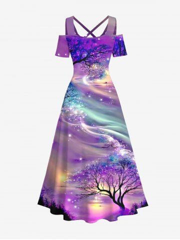 Plus Size Tree Aurora Galaxy Glitter 3D Print Cold Shoulder Crisscross Hawaii Maxi Dess - Light Purple - 1x