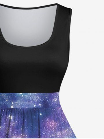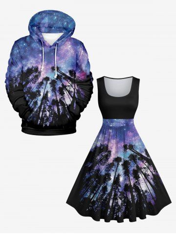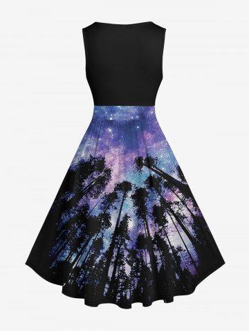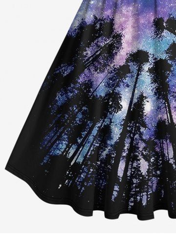 Plus Size Tree Forest Colorful Ombre Galaxy Print Hawaii Vintage Swing A Line Dress - Black - L