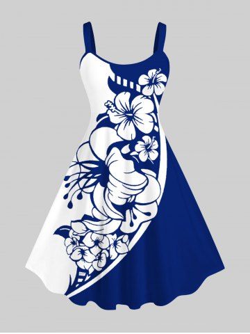 Plus Size Tripical Leaf Hibiscus Flower Two Tone Colorblock Print Hawaii Tank Dress - Multi-a - 3x
