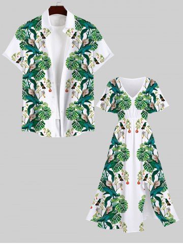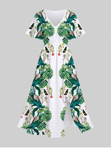 Plus Size Tropical Coconut Leaves Floral Print Hawaii Split Pocket A Line Midi Dress - Green - M