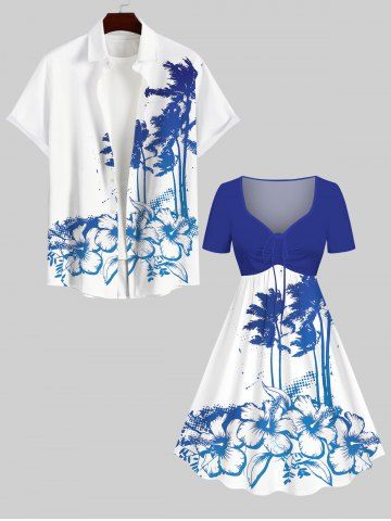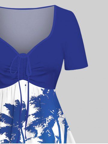 Plus Size Tropical Coconut Tree Hibiscus Flower Print Cinched Hawaii Dress - Sky Blue - 3x