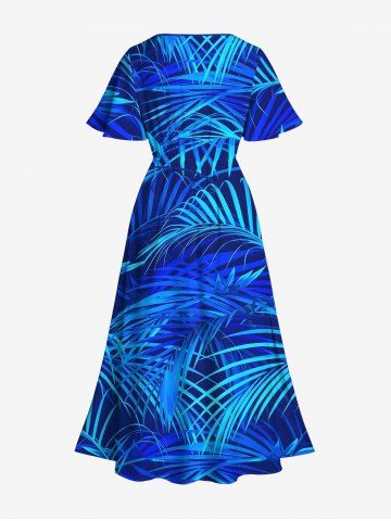 Plus Size Tropical Coconut Tree Leaf Print Split Hawaii Midi Dress - Blue - L