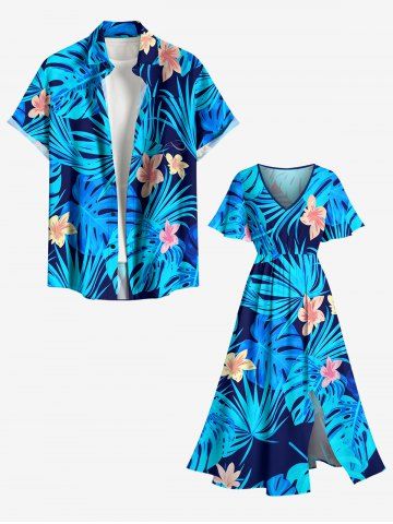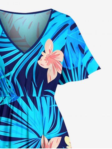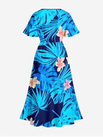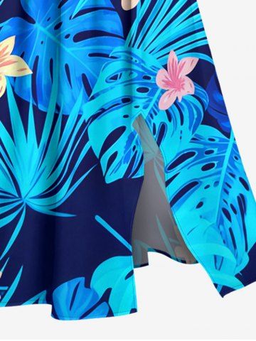 Plus Size Tropical Flower Leaf Print Split Hawaii Midi Dress - Blue - Xxs