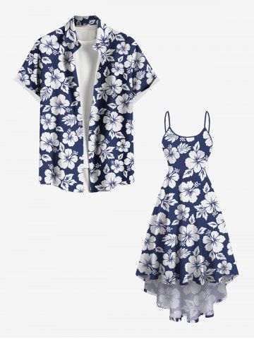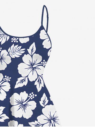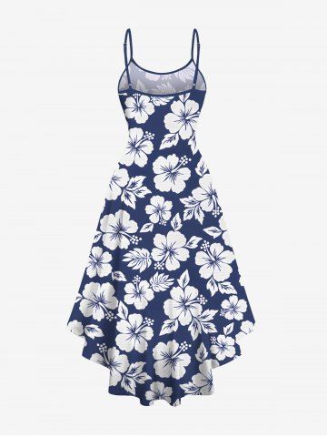 Plus Size Tropical Flowers Leaf Print High Low Hawaii Cami Dress - Deep Blue - M