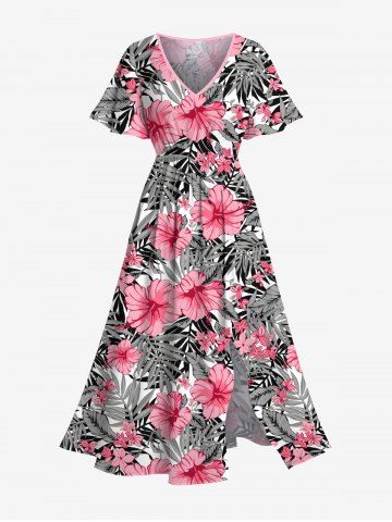 Plus Size Tropical Flowers Leaf Print Split Hawaii Midi Dress - Light Pink - 6x