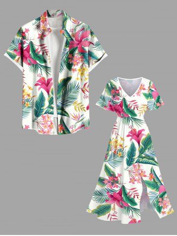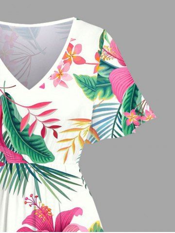 Plus Size Tropical Flowers Leaf Print Split Hawaii Midi Dress - White - S