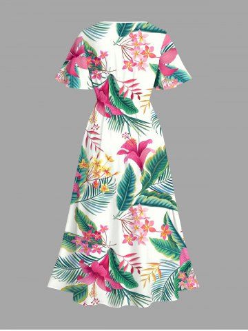 Plus Size Tropical Flowers Leaf Print Split Hawaii Midi Dress - White - L