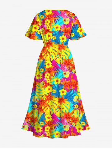 Plus Size Tropical Flowers Leaf Print Split Hawaii Midi Dress - Yellow - L